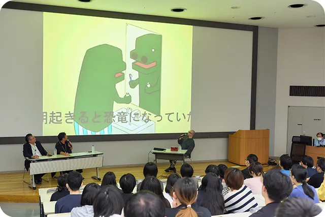 はい。(スクリーンを見ながら)タイトルは『恐竜日和』です。朝起きたら突然恐竜になっていたというお話です。友だちと二人で作画を分担し、マンガ・アニメーション科の同級生たちと制作しました。(作品を見終わり一同拍手)ありがとうございます。全体を通して、止めるべきところは止め、動かすべきところは動かして、皆でよくやったなと思います。