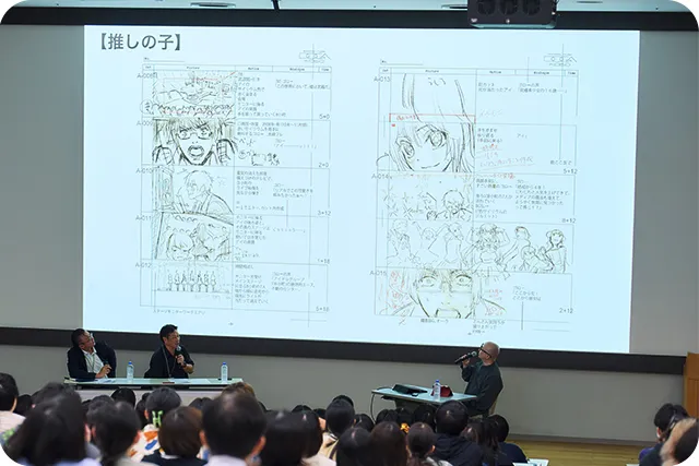 はい。(スクリーンに絵コンテが映し出されると学生たちから一斉に感嘆のため息)これがいい絵コンテかどうかは別にして、いい絵コンテは読みやすいですね。だからみなさんも読みにくいなと思ったら書き直してください。『【推しの子】』の私の絵コンテの特徴は、芝居が足りないことです。私はレイアウトは決めますが、芝居を考えることはアニメーターの楽しさのひとつだと思っているので、あえて芝居まで入れていないんです。もっとも、どう描いても自由なので、芝居まできっちり描く方もいます。最近ではデジタルツールを使ってフルカラーで描く方もいますね。