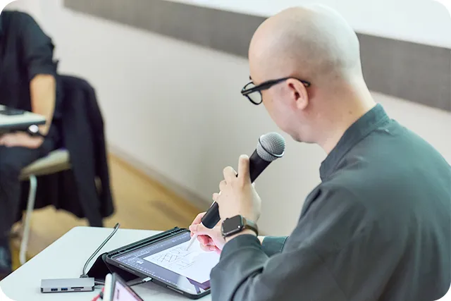 はい。(手元のタブレットの描画画面をスクリーンに映しながら)例えば、二人のキャラが真横に向かい合っていて、それを引きで描いている構図ってよくありがちなんですけど、これが浮かんだら一旦ペンを置いて考え直してください。これがなぜいけないかというと、全部状況説明になっていて、絵が引いていることによって視聴者の気持ちも引くんです。没入感が削がれ、何を見ればいいかわからなくなるんですね。みんな最初はやりがちですし、僕もやったことがありますが、注意してください。