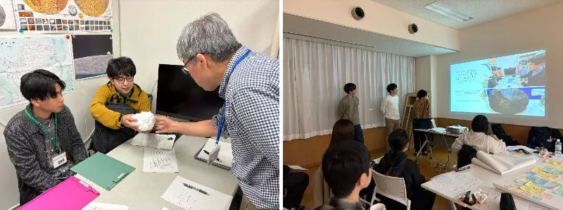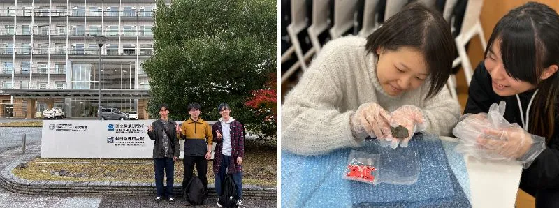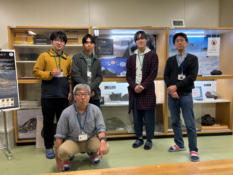 訪問では、極地科学資源センターの南極隕石ラボラトリーに所属する山口亮先生、今榮直也先生、中藤学術支援技術専門員から、火星や隕石に関する詳しい解説をしていただきました。実際に手に取った火星の石の一部は、想像以上の重さがあり、「この石が太陽系を旅して地球に落下し、南極地域観測隊に発見されて、今自分の手元にある」という事実に、学生たちは強いロマンと感動を覚えました。