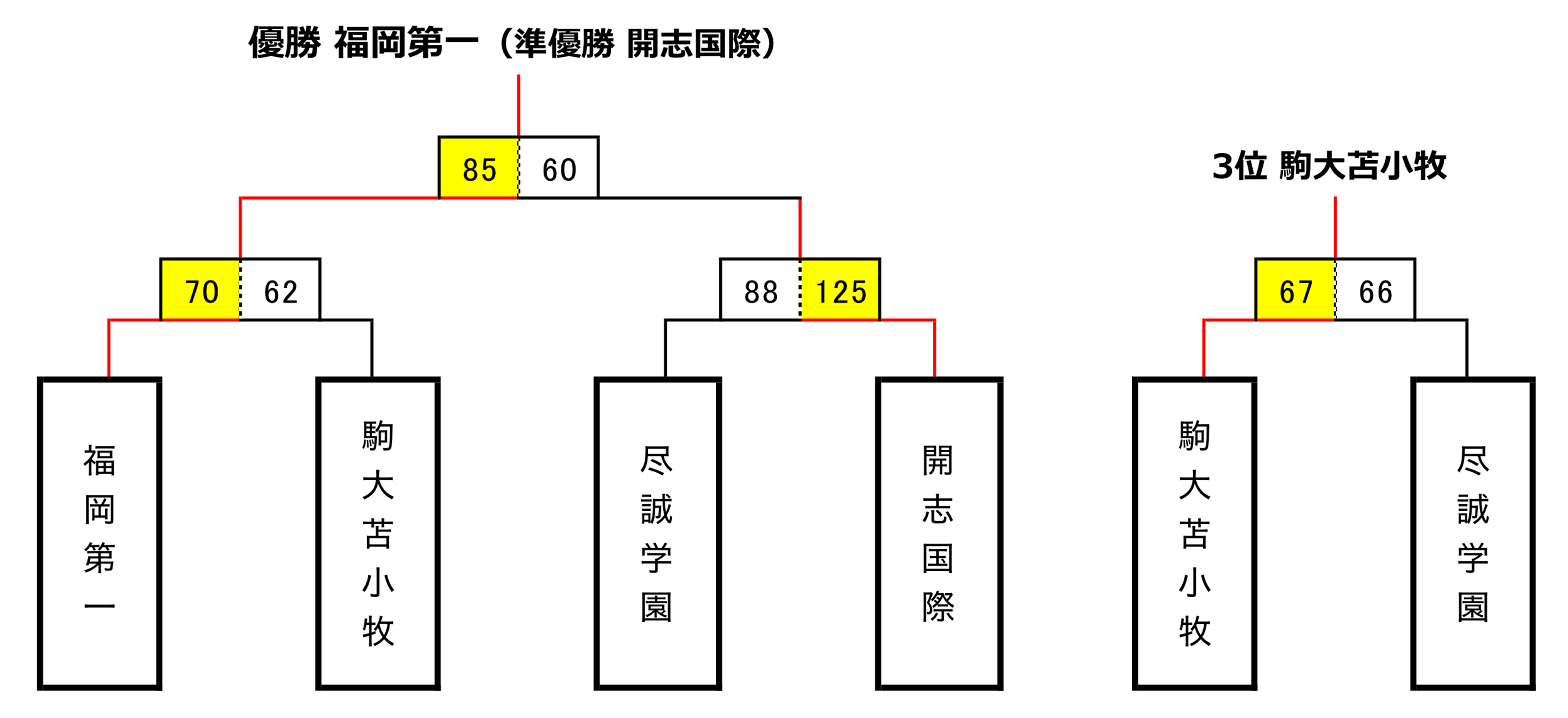 優勝した福岡第一は、予選リーグで他を寄せ付けない安定した戦いで全勝。決勝トーナメントでは、準決勝で駒大苫小牧(北海道)に70-62で競り勝ち、決勝は本大会2連覇中の開志国際(新潟)と対戦。1Qは19-19で競り合うも2Qは福岡第一が連続得点を決めるなど圧倒し48-27で前半を折り返すと、後半も安定した試合展開で最終スコア85-60で3大会ぶりの栄冠を手にしました。準優勝した開志国際は、準決勝では予選リーグで強豪八王子(東京)を破った尽誠学園(香川)に125-88で快勝するなど安定した実力を見せました。3位決定戦では、駒大苫小牧が尽誠学園との1点を争う激しい競り合いを67-66で制し、本大会では過去最高の3位となりました。大会MVPには藤田悠暉選手(福岡第一)、同MIPには髙橋歩路選手(開志国際)が選ばれました。