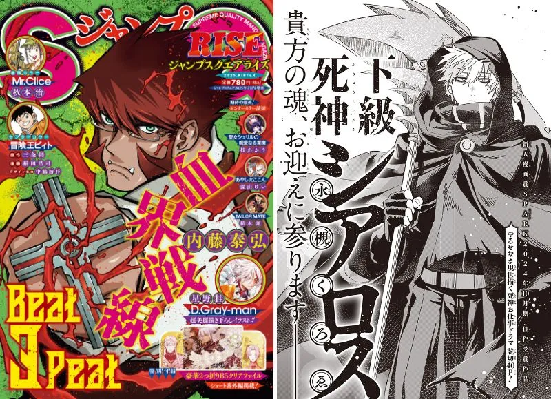 集英社ジャンプスクエア 新人漫画賞SPARK 2024年10月期にて、佳作を受賞しましたマンガ・アニメーション科の永槻くろゑさん作『下級死神シアロス』が、現在発売中の「ジャンプSQ.RISE 2025 WINTER」にて掲載されました!