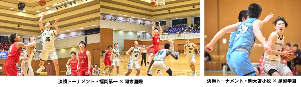 優勝した福岡第一は、予選リーグで他を寄せ付けない安定した戦いで全勝。決勝トーナメントでは、準決勝で駒大苫小牧(北海道)に70-62で競り勝ち、決勝は本大会2連覇中の開志国際(新潟)と対戦。1Qは19-19で競り合うも2Qは福岡第一が連続得点を決めるなど圧倒し48-27で前半を折り返すと、後半も安定した試合展開で最終スコア85-60で3大会ぶりの栄冠を手にしました。準優勝した開志国際は、準決勝では予選リーグで強豪八王子(東京)を破った尽誠学園(香川)に125-88で快勝するなど安定した実力を見せました。3位決定戦では、駒大苫小牧が尽誠学園との1点を争う激しい競り合いを67-66で制し、本大会では過去最高の3位となりました。大会MVPには藤田悠暉選手(福岡第一)、同MIPには髙橋歩路選手(開志国際)が選ばれました。