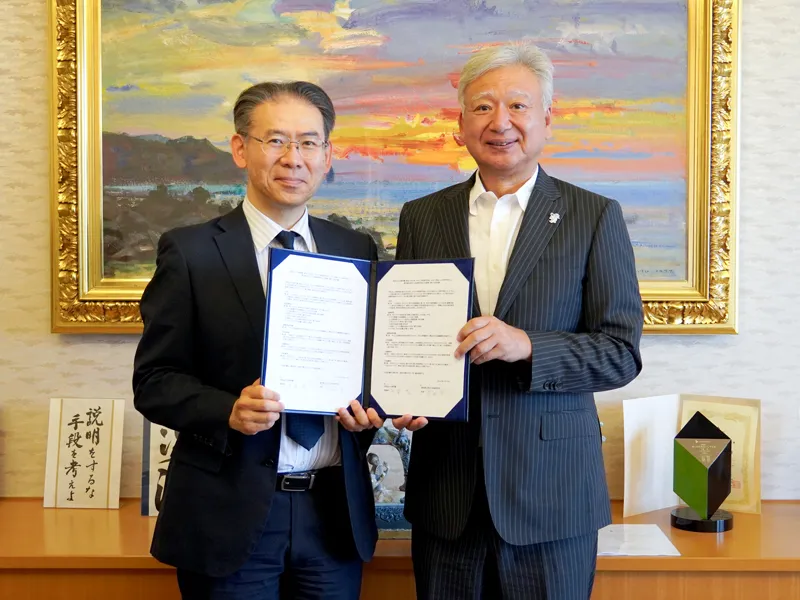7⽉14⽇に本学園蒲⽥キャンパスで⾏われた締結式では、荒川⼯科⾼等学校の⻑⽥学校⻑と本学園の千葉茂理事⻑が協定書に署名し、教育連携に向けて両校の職員間で意⾒交換が⾏われました。