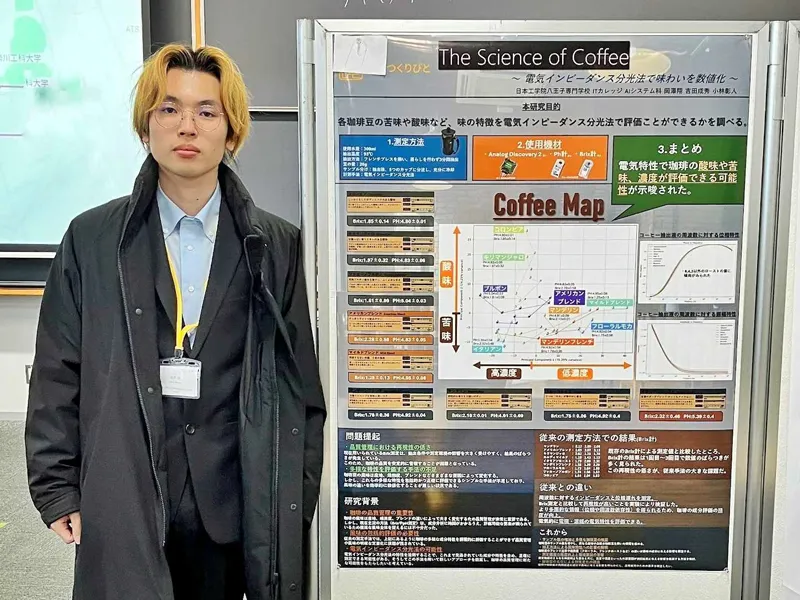 今回受賞対象となったのは、「電気インピーダンス分光法で味わいを数値化」と題した研究発表です。この研究は、多くの人にとって身近な嗜好品であるコーヒーを題材に、苦味や酸味といった複雑な「味わい」の特徴を、電気的な特性を利用して客観的に評価する可能性を追求したものです。※電気インピーダンス・・・交流電流の流れにくさを表す数値