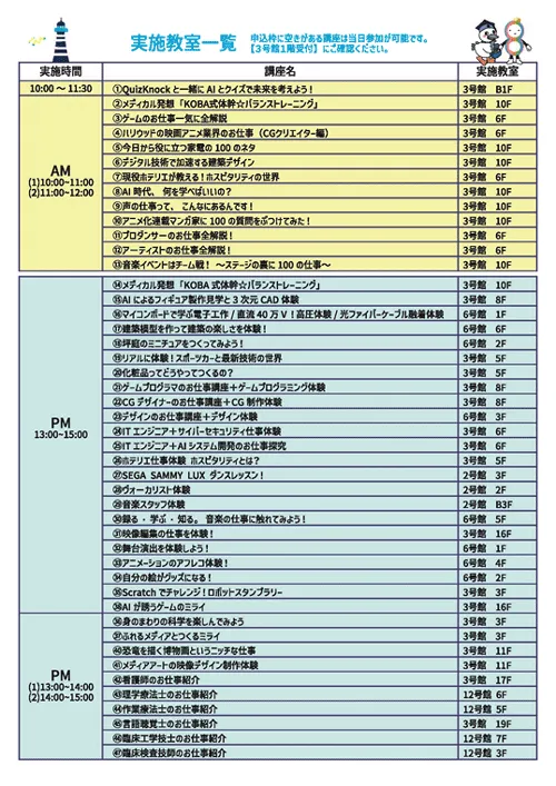 AI、ゲーム、アニメ、ミュージック、観光、建築、スポーツ、医療など、さまざまな仕事について知ることができる、多彩なメニュー約50種類の講座にたくさんの皆様にご参加いただきました。