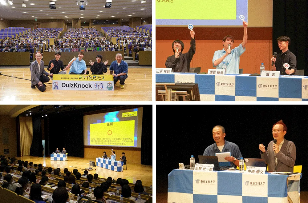 知的エンタメ集団としてテレビやYouTubeで活躍するQuizKnockから山本祥彰さん、須貝駿貴さん、東言さんをゲストにお招きしてのAIに関してのスペシャルトークセッションでは、併設校東京工科大学コンピュータサイエンス学部の生野教授、中西教授と共にAIが作成した問題のクイズ対決やAIに関する今後の仕事や受験などへの影響といったテーマに基づいたトークなどで非常に盛り上がりました。