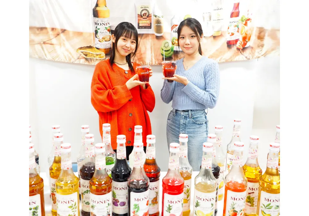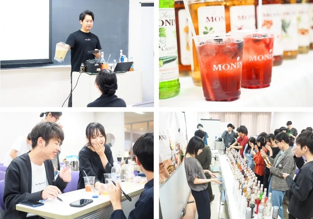 昨年度に引き続き、今年度も日仏貿易(株)※様にご協力いただき、「MONIN(モナン)」を使用したノンアルコールカクテル制作講座を開催していただきました。講座は「MONIN」の特長の解説、「MONIN」を使ったスムージー&ノンアルコールカクテル制作実演を行っていただいた後、学生たちは「MONIN」を使用したオリジナルノンアルコールカクテル制作に挑戦。当日は80種類以上の「MONIN」のフレーバーシロップを日仏貿易様からご提供いただきました。