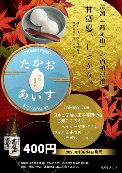 「たかおあいす」は、清酒「高尾山」の酒粕を使用した甘酒味のアイスで、10月14日より高尾山の売店「高尾山スミカ」にて税込400円で販売されています。