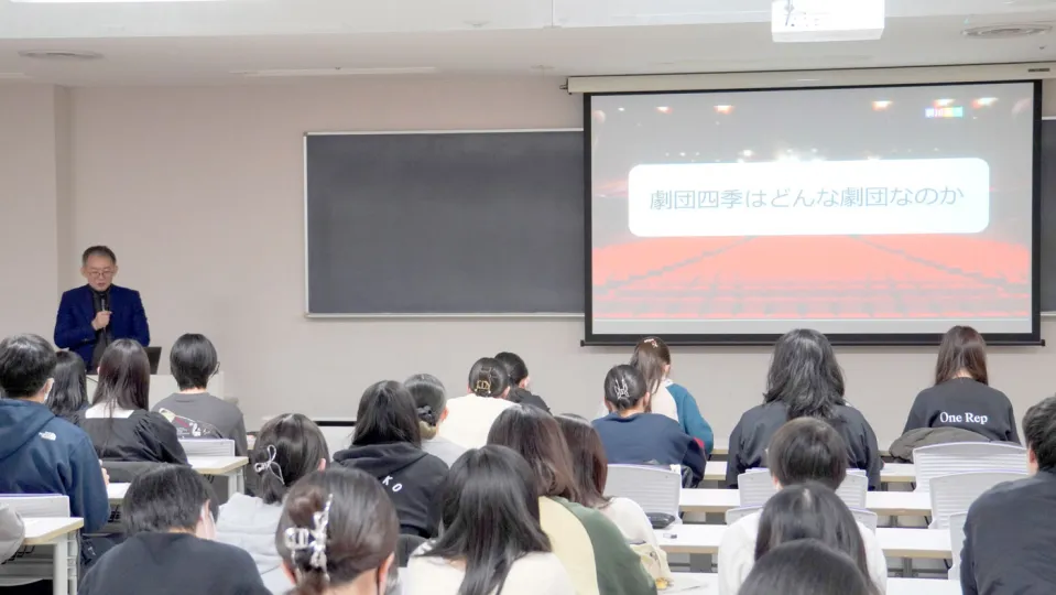 説明会では、東さんが演劇スタッフ科を卒業してから劇団四季に入るまでの道のりや、舞台監督としてどのような仕事をしてきたのかといった経験談をたっぷり披露してくださいました。実際にどんな作品を担当してきたのか、舞台の裏側でどんな準備や段取りを重ねているのかなど、普段はなかなか聞けないリアルなお話に、学生たちは真剣な表情で耳を傾けていました。 さらに、劇団四季の沿革や理念、技術スタッフが担う役割についても分かりやすく紹介していただき、参加した学生にとって、劇団四季がどんな想いで舞台づくりを行っているのかを改めて知る貴重な機会となりました。