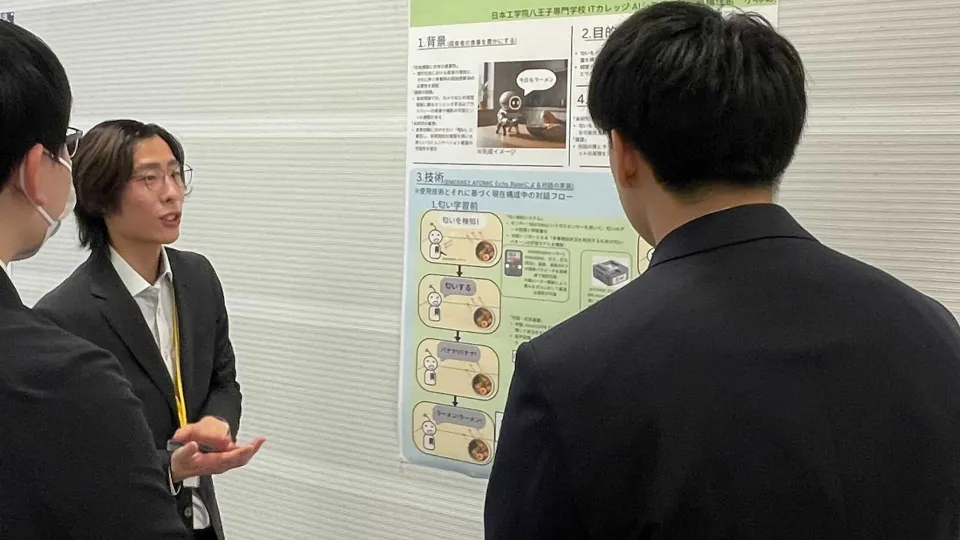 2025年11月に開催された「IEEE TOWERS 2025」では、比留間さんが『BME688センサを用いた客観的香水分類と「香りの地図」の提案』を、高橋さんは『匂いトリガー型共食コミュニケーションロボット対話基盤』を発表。当日会場では、参加者がポスター発表を行い、若手研究者同士、そして企業、研究者の方々との間で活発な議論が交わされました。たくさんの発表の中から、比留間さんの発表が、Undergraduate Student Award