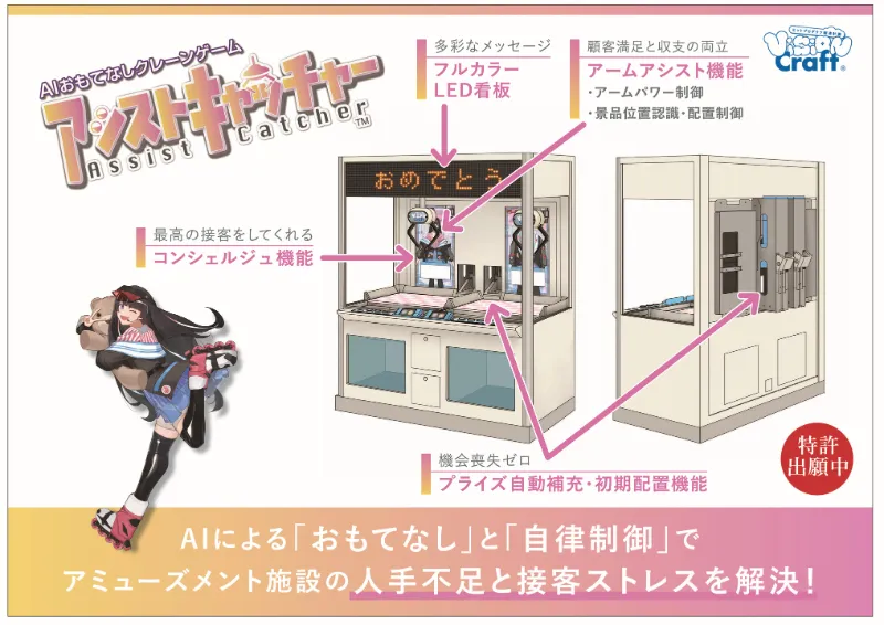 AIがお客様の表情や状況を読み取り、声かけや操作の補助、景品の再配置を行います。