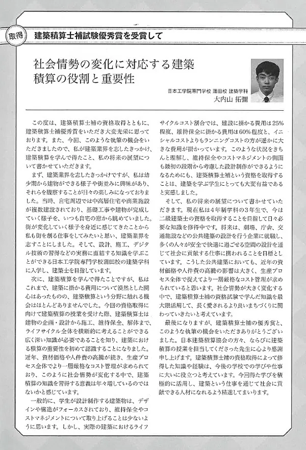 日本建築積算協会が発行している季刊誌に大内山さんの今後の将来への展望等について受賞者コメントが掲載されました。