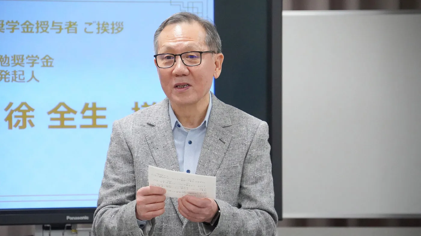 当日は、成績・出席ともに優秀で、明確な目的意識と強い自立心を持つ留学生11名が奨学生として選出され、徐様より一人ひとりに奨学金30万円の目録が授与されました。