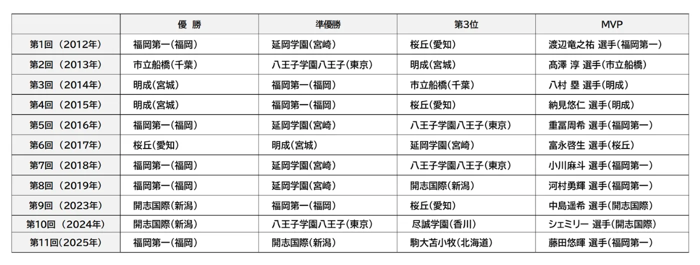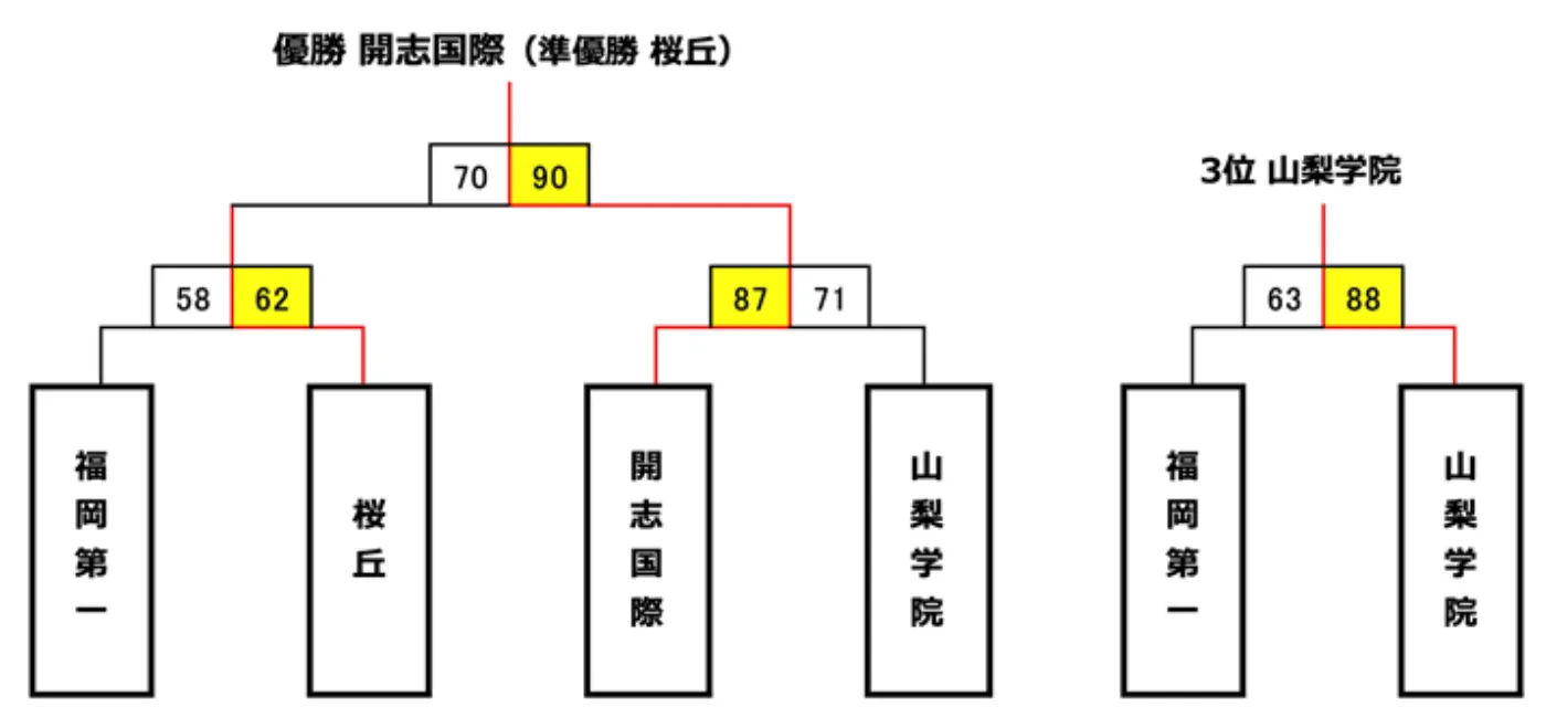 優勝した開志国際は、予選リーグを安定した戦いで3戦全勝し、準決勝では初めてベスト4に進出した山梨学院に87-71で勝利。決勝では、準決勝で昨年王者の福岡第一に勝利した桜丘と対戦しました。前半は両校譲らず2Q終了時点45-44の1点リードで折り返すと、後半は開志国際が安定した試合展開で強さをみせ、最終スコア90-70で3度目の栄冠を手にしました。準優勝した桜丘は、予選リーグで地元の強豪八王子などに勝利し、準決勝では福岡第一との4点差の接戦を62-58で制し、2017年の優勝に次ぐ健闘を見せました。3位決定戦では、今大会予選から安定した強さを見せた山梨学院が、本大会最多5度の優勝を誇る福岡第一との戦いも88-63で制し、過去最高成績となる3位となりました。大会MVPには高橋歩路選手(開志国際)、同MIPには竹内光一選手(桜丘)が選ばれました。
