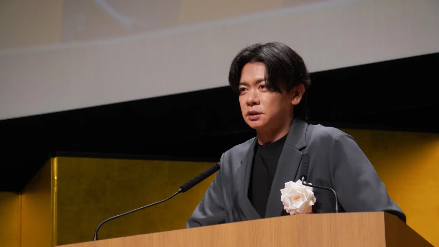 また蒲田校では、大田区長 鈴木晶雅様(代読)と、芸人・クリエイターとして幅広く活躍されている野田クリスタル様より祝辞を賜りました。野田様は、テレビ番組「野田クリの野望」に本校学生が出演し、昨年は学園祭での公開収録にもご協力いただくなど、本校と深いご縁をいただいております。野田様からは、過去にご自身で制作されたゲームをスクリーンに投影しながら楽しい祝辞をいただくとともに、これからクリエイターをめざす新入生に対して温かいエールをいただきました。