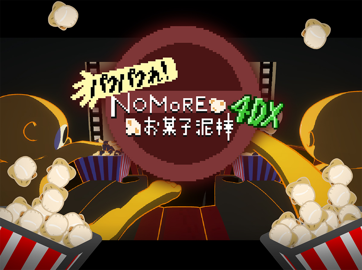映画館で隣の人のポップコーンを盗み食いするゲームです。 見ている人に「気になる」と思わせるため、見た目をトゥーン調で丸みを帯びたデザインにしたり、分かりやすく大袈裟にリアクションを返すことで「とっつきやすさ」を高めました。初期の「振り検知」は常に一定のしきい値でしたが、「振るのを止めてないのに止まる判定になる」問題がありました。なるべく直感に近づけるために、振る前はしきい値を高めにして、振り始めたらしきい値を少し下げる事で、自分の意思で「振った・止めた」という感覚をより強く感じてもらえるようにしました。